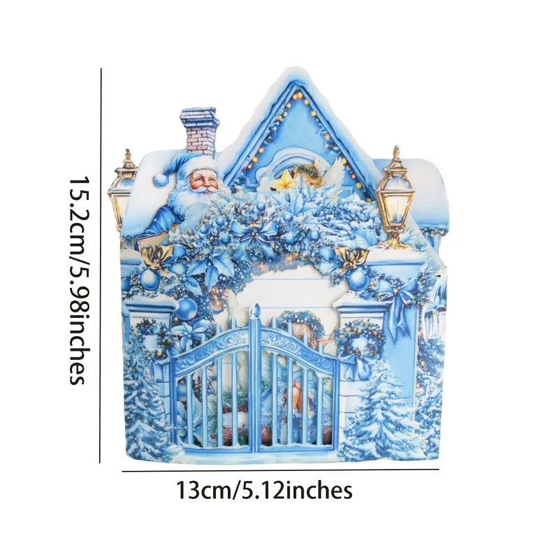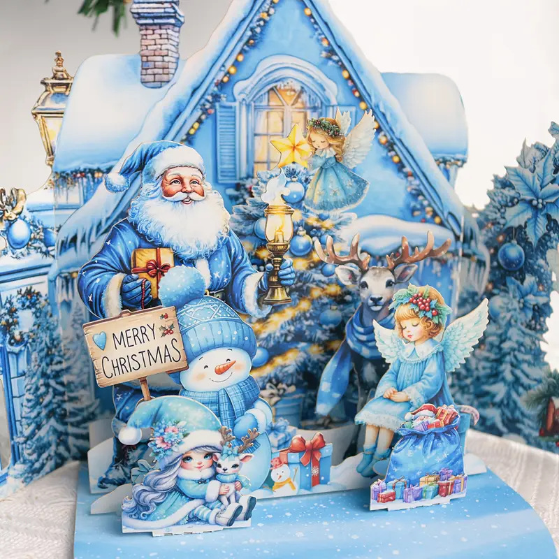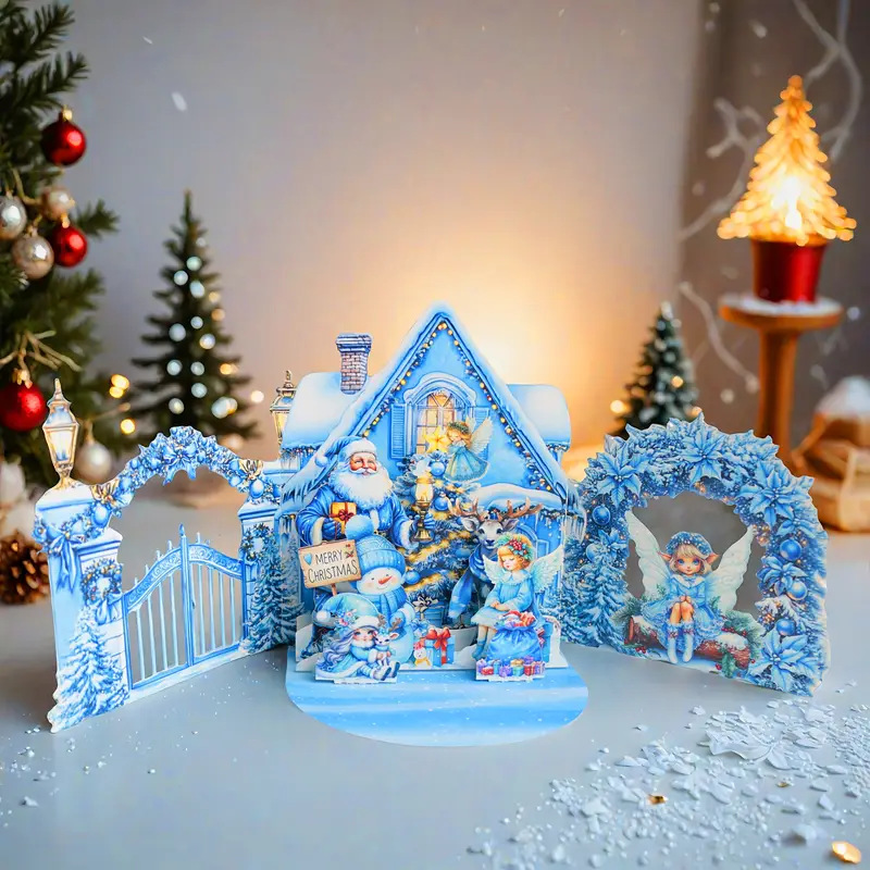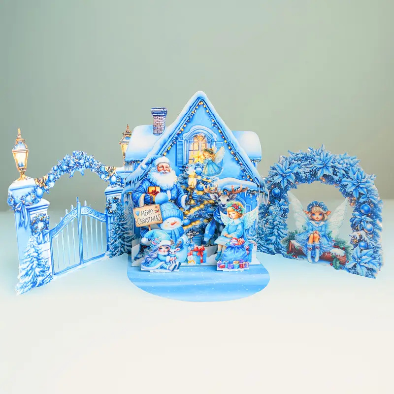 This is a custom-designed 3D pop-up Christmas card featuring a magical icy-blue winter scene, complete with Santa, snowmen, fairies, and a cozy snow-covered cottage, perfect for sending heartfelt holiday wishes.