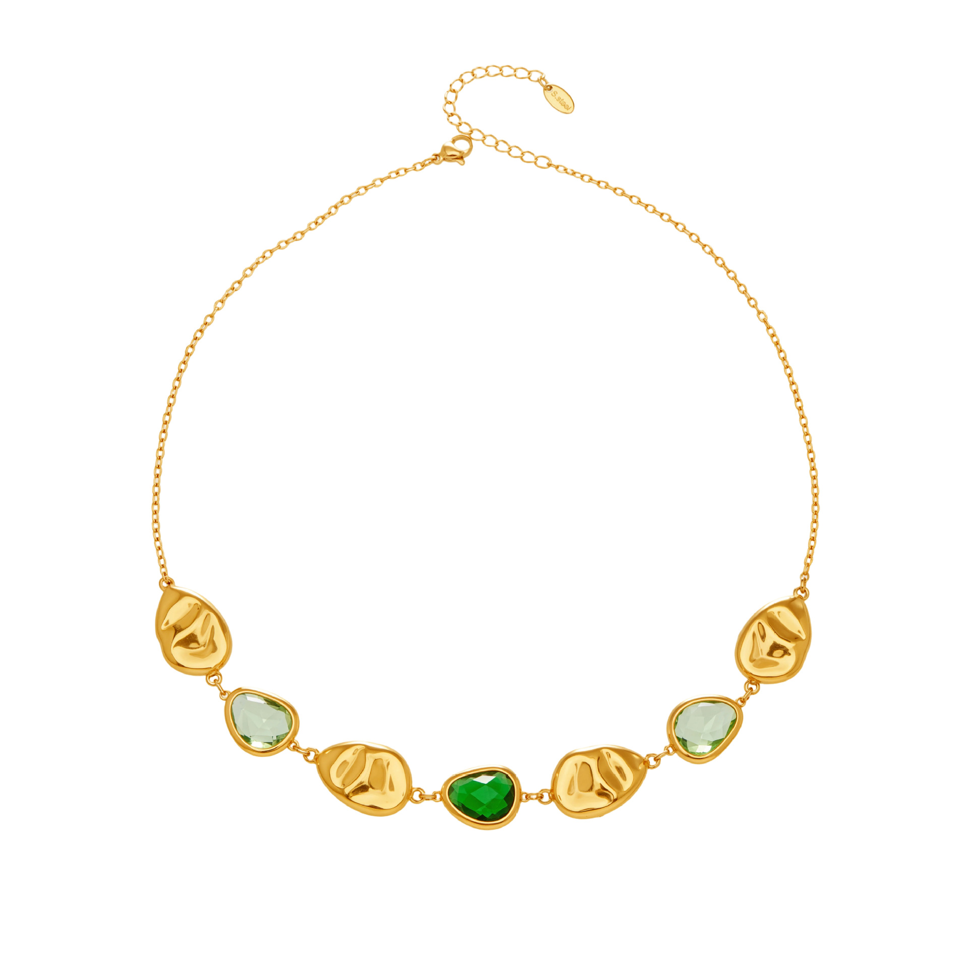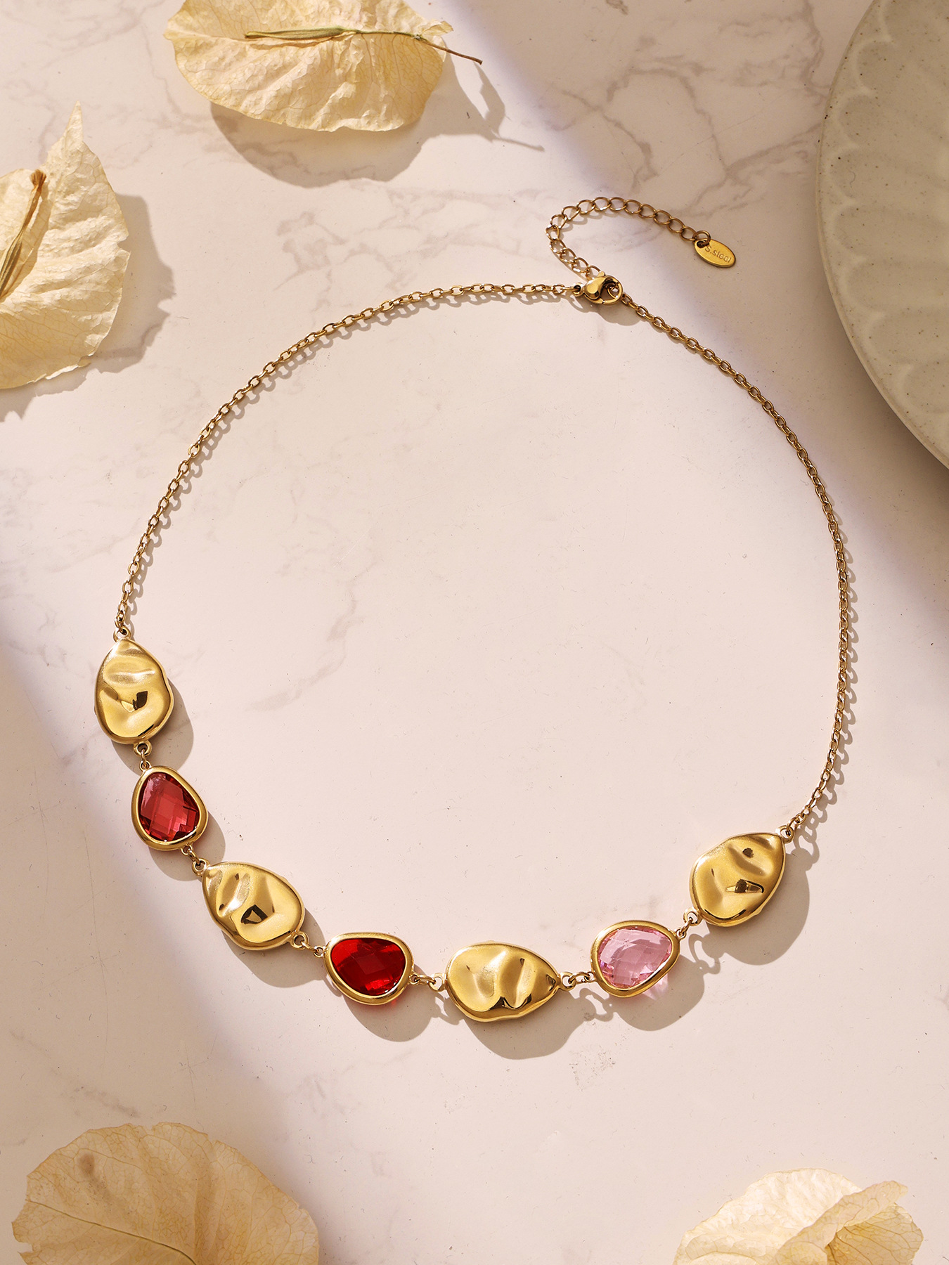 Each link features hand-finished, irregular hammered gold settings, framing vibrant waterdrop glass stones in rich red, deep blue, and lush green hues. The sculptural, textured metal adds an artisanal, organic feel, while the pop of color brings a playful, eye-catching energy that balances elegance and edge. Perfect for dressing up a casual brunch look, elevating office wear, or making a statement at evening events, this necklace is designed to be your signature piece.