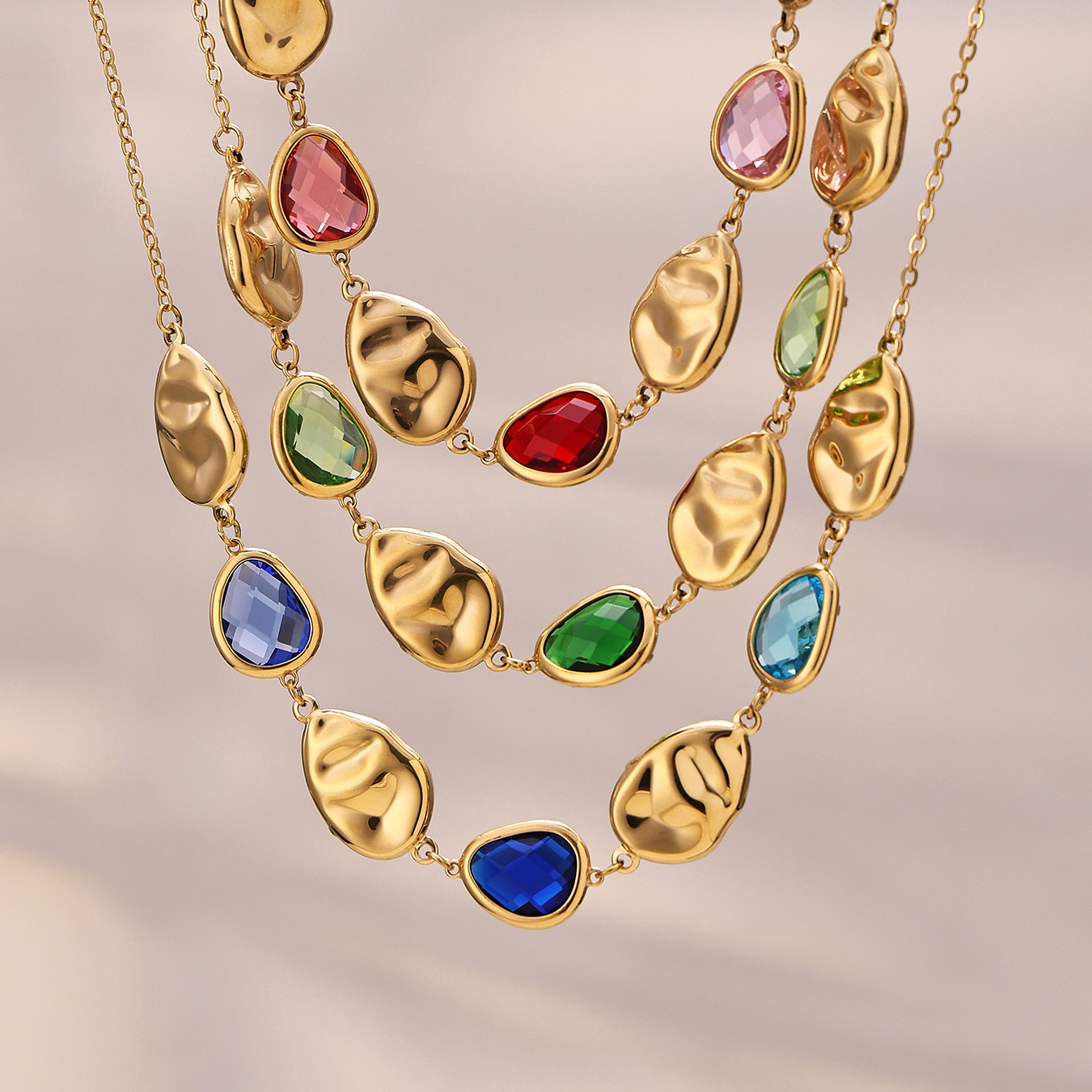 We use 3-micron PVD vacuum gold plating, the gold standard for durable, long-lasting luxury plating. Unlike cheap, thin plating that wears off in weeks, our advanced PVD process bonds the gold to the stainless steel at a molecular level, creating a scratch-resistant, tarnish-proof finish that retains its brilliant, rich gold shine for years. The bezel-set glass stones are secured with precision craftsmanship, ensuring each stone stays firmly in place, while the hand-hammered metal texture adds a unique, high-end finish that sets this piece apart from fast fashion alternatives.
