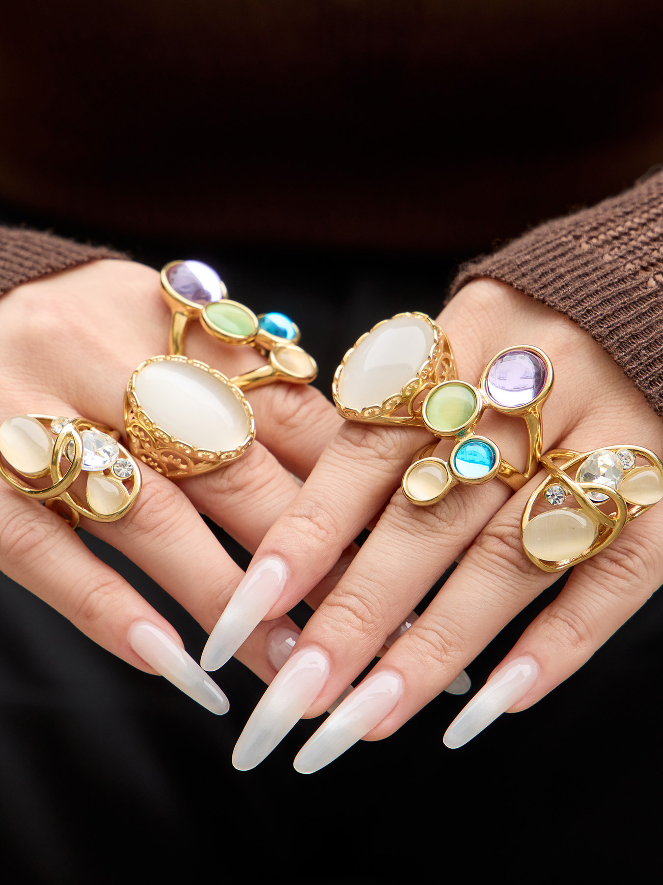 Stainless Steel Open Cuff Cat's Eye Statement Ring Set