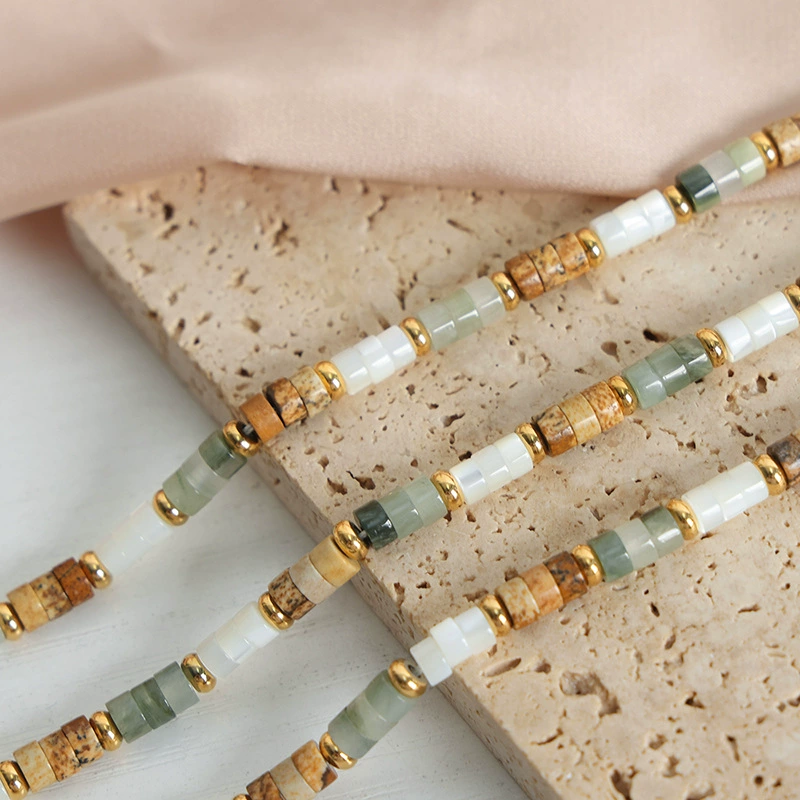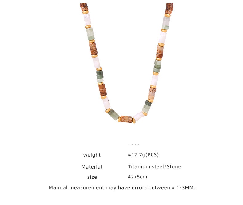 Bohemian beaded necklace crafted with durable titanium steel & natural stones (earthy green/white/brown hues). Adjustable 42+5cm length, lightweight (≈17.7g) for daily chic & casual styling.