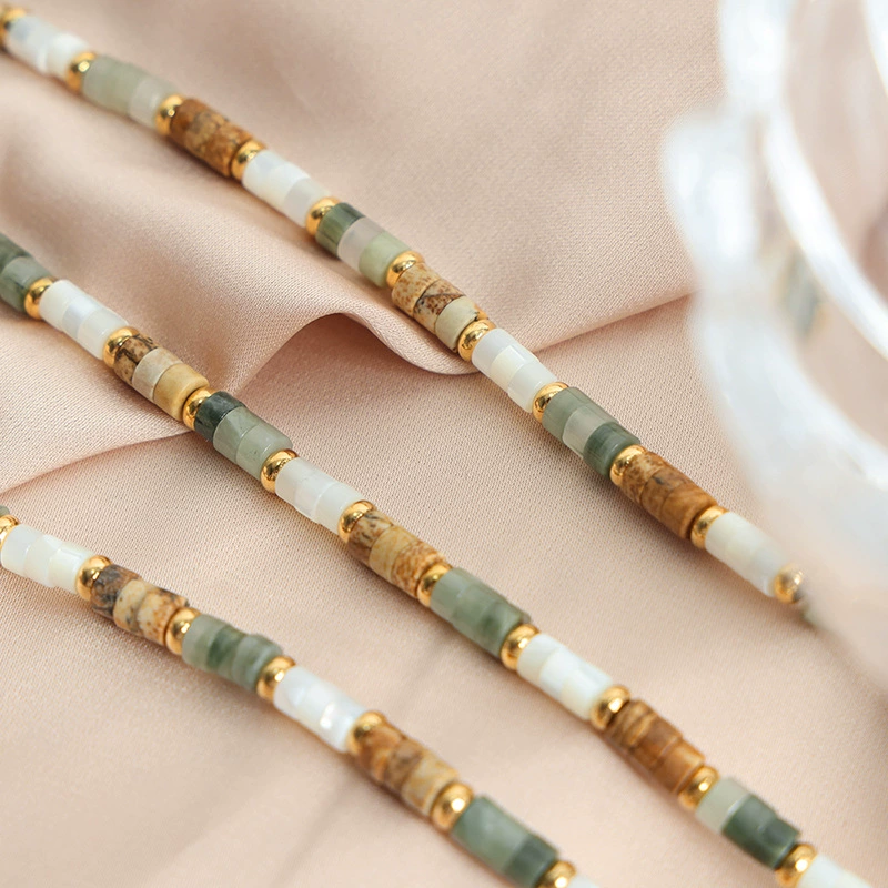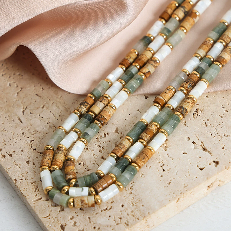 Hand-strung with mixed natural stones (soft green, warm brown, creamy white) and accented with tiny gold beads, this necklace leans into retro-luxe, niche design — perfect for the fall/winter season’s cozy, elevated aesthetic.