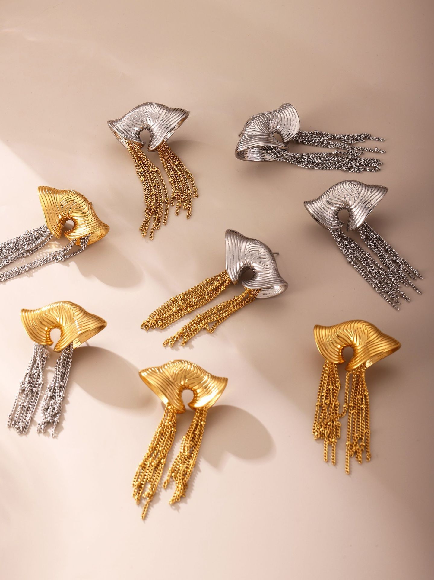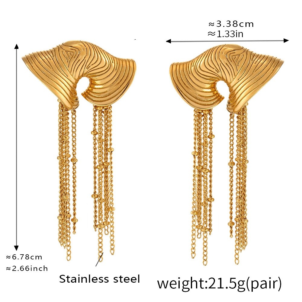 A modern masterpiece of wearable art, these earrings combine a fluid, textured wave motif with delicate chain tassels that catch the light with every movement. Made from premium stainless steel and finished in rich gold plating, they blend durability with high-fashion appeal. The 6.78cm drop creates a striking silhouette, perfect for elevating contemporary jewelry collections.