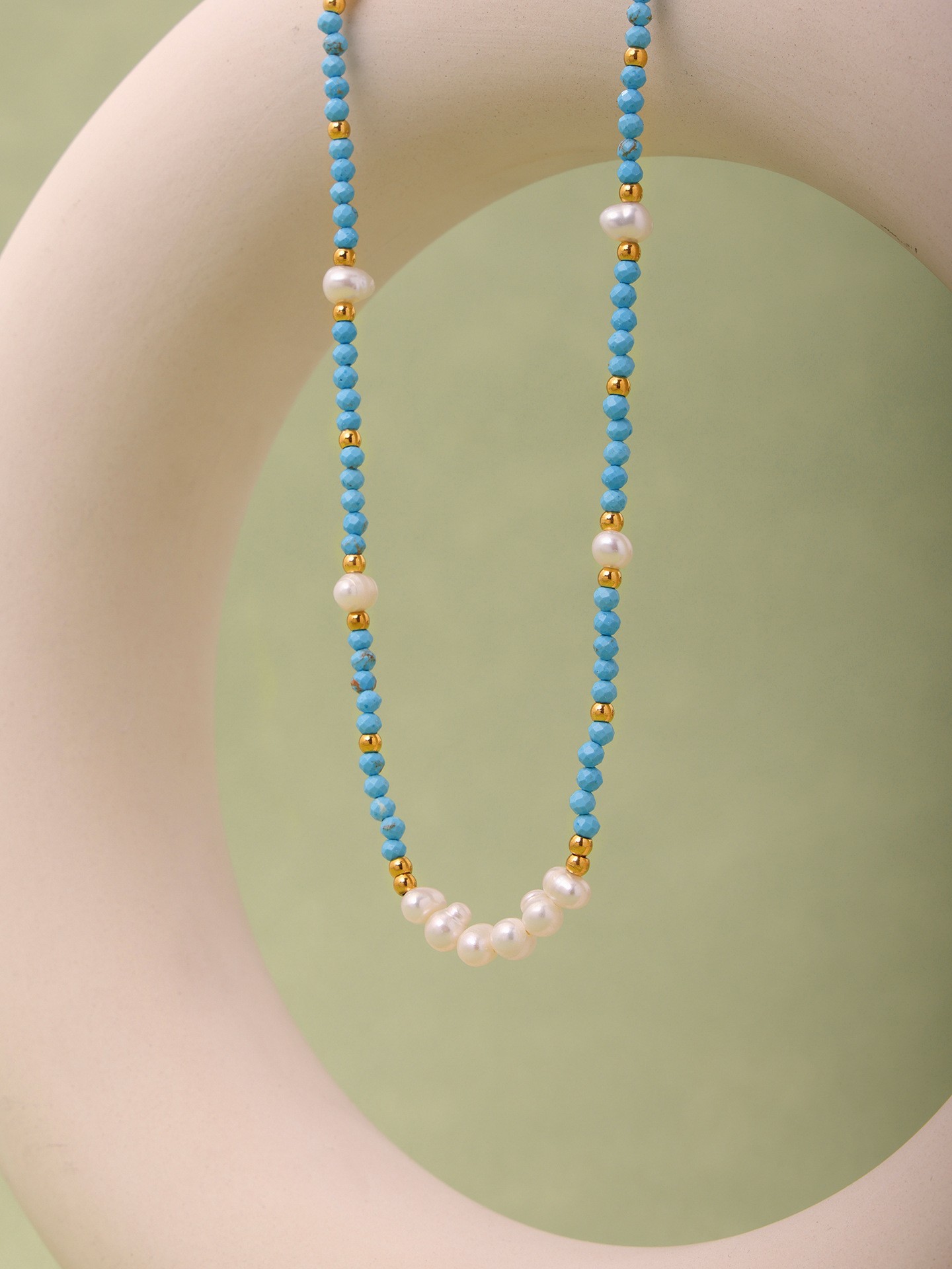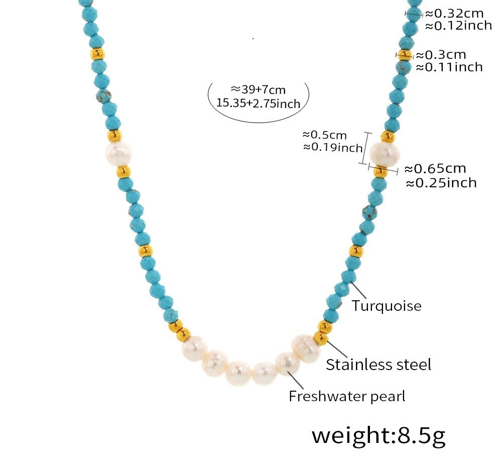 This beaded necklace combines natural turquoise, lustrous freshwater pearls, and polished stainless steel accents for a unique, bohemian-chic aesthetic. The hypoallergenic, tarnish-free stainless steel ensures lasting durability, while the vibrant turquoise and classic pearls create a versatile piece perfect for both casual and semi-formal wear. Designed with an adjustable length of 39+7cm, it offers a comfortable fit for all neck sizes. Fully compliant with CE, RoHS & CPSIA standards, this necklace is ideal for wholesale orders, private labeling, and retail distribution.