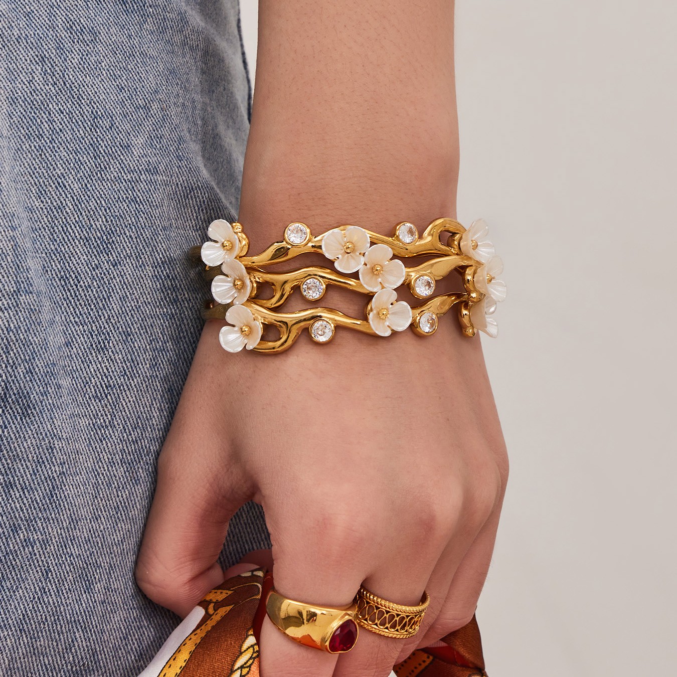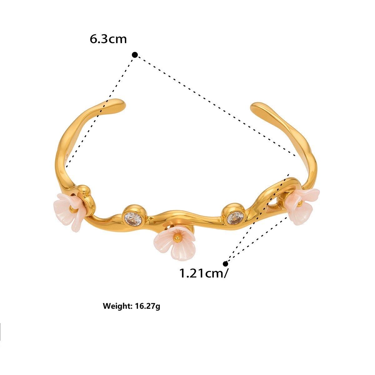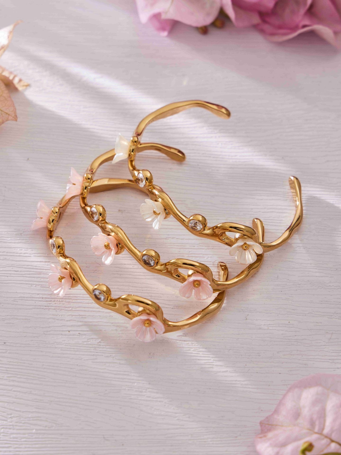 This elegant cuff bracelet features a nature-inspired design with delicate handcrafted shell flower motifs in soft pink and creamy white, set along a textured golden branch-like band. Sparkling crystal accents add a touch of luminous charm, while the open cuff style ensures a comfortable, adjustable fit. Perfect for elevating any outfit with a whimsical, romantic touch.