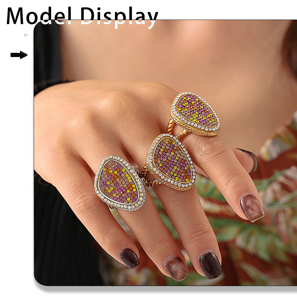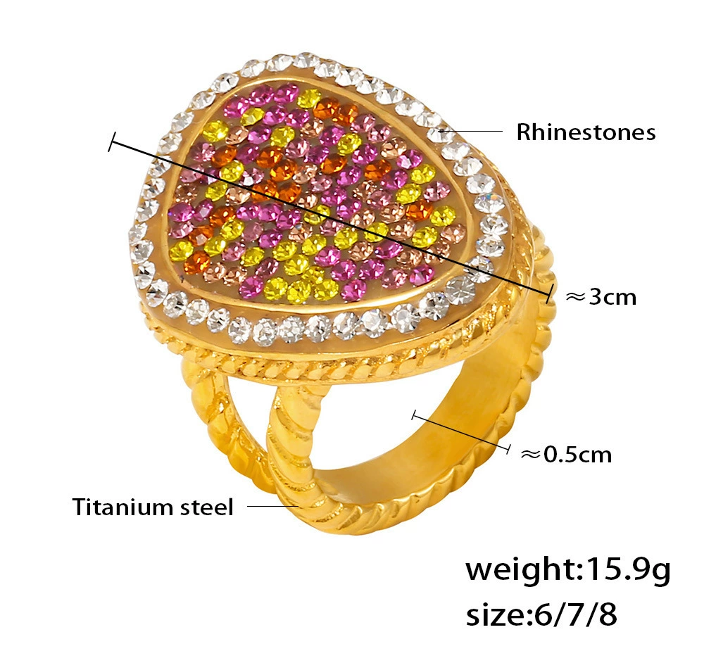 This triangle-shaped ring is crafted from durable, gold-tone titanium steel (15.9g, sizes 6/7/8), featuring a vibrant multicolored rhinestone inlay (pink, yellow, orange) framed by clear rhinestones for sparkling allure.